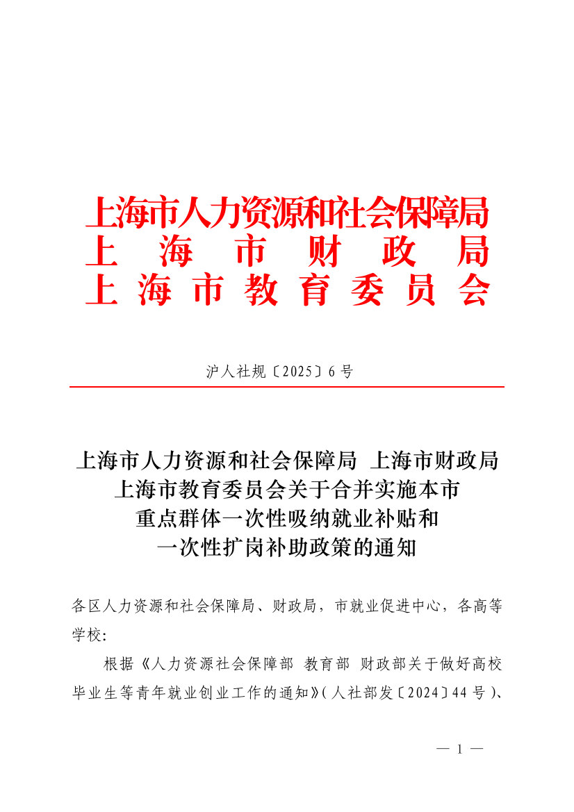 上海市人力资源和社会保障局 上海市财政局 上海市教育委员会关于合并实施本市重点群体一次性吸纳就业补贴和一次性扩岗补助政策的通知