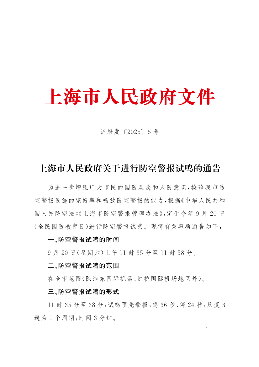 为进一步增强广大市民的国防观念和人防意识,检验我市防空警报设施的完好率和鸣放防空警报的能力,根据《中华人民共和国人民防空法》《上海市防空警报管理办法》,定于今年9月20日(全民国防教育日)进行防空警报试鸣。现将有关事项通告如下: