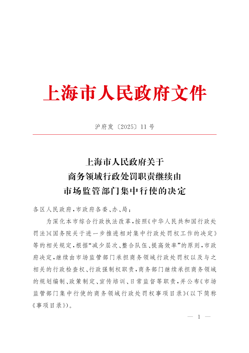 为深化本市综合行政执法改革,按照《中华人民共和国行政处罚法》《国务院关于进一步推进相对集中行政处罚权工作的决定》等的相关规定,根据“减少层次、整合队伍、提高效率”的原则,市政府决定,继续由市场监管部门承担商务领域行政处罚权以及与之相关的行政检查权、行政强制权职责,商务部门继续承担商务领域的规划编制、政策制定、宣传培训、日常监督等职责,并公布《市场监管部门集中行使的商务领域行政处罚权事项目录》(以下简称《事项目录》)。