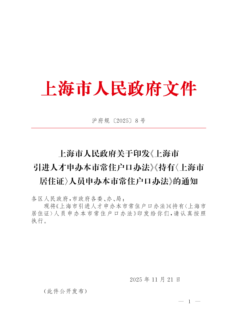 本办法自2025年12月1日起施行,有效期至2030年11月30日。2024年12月市政府印发的《持有〈上海市居住证〉人员申办本市常住户口办法》(沪府规〔2024〕17号)同时废止。