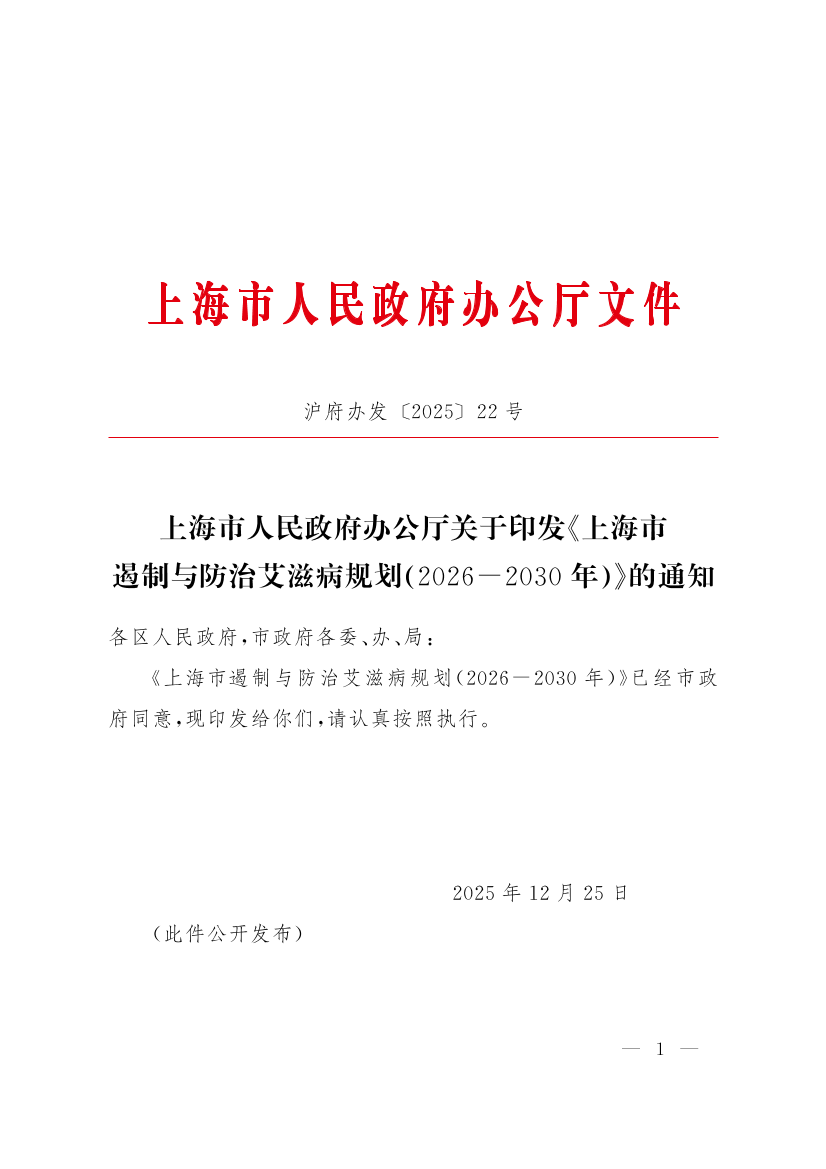 《上海市遏制与防治艾滋病规划(2026-2030年)》已经市政府同意,现印发给你们,请认真按照执行。