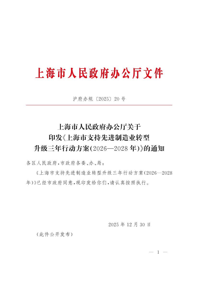 《上海市支持先进制造业转型升级三年行动方案(2026—2028年)》已经市政府同意,现印发给你们,请认真按照执行。