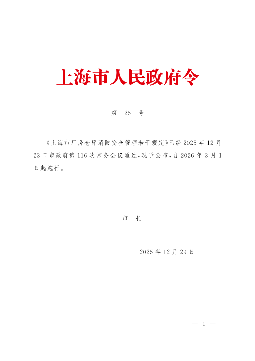 《上海市厂房仓库消防安全管理若干规定》已经2025年12月23日市政府第116次常务会议通过,现予公布,自2026年3月1日起施行。