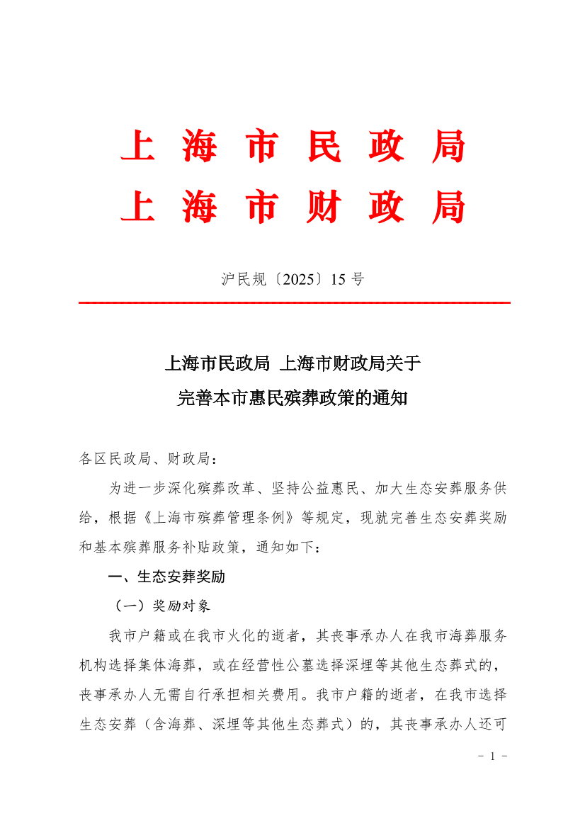 为进一步深化殡葬改革、坚持公益惠民、加大生态安葬服务供给,根据《上海市殡葬管理条例》等规定,现就完善生态安葬奖励和基本殡葬服务补贴政策,通知如下: