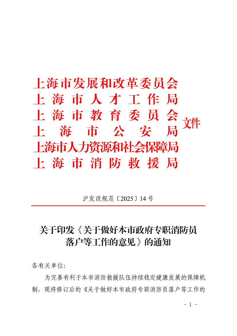 参照《持有<上海市居住证>人员申办本市常住户口办法》(沪府规〔2025〕8号)、《上海市居住证积分管理办法》(沪府规〔2022〕21号)及非上海生源应届普通高校毕业生进沪就业等政策,结合消防救援职业特点,进一步明确本市政府专职消防员申办户籍、居住证积分等相关条件,加大职业保障力度。
