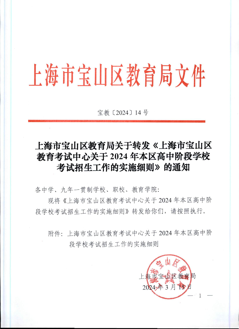 现将《上海市宝山区教育考试中心关于2024年本区高中阶段学校考试招生工作的实施细则》转发给你们,请按照执行。