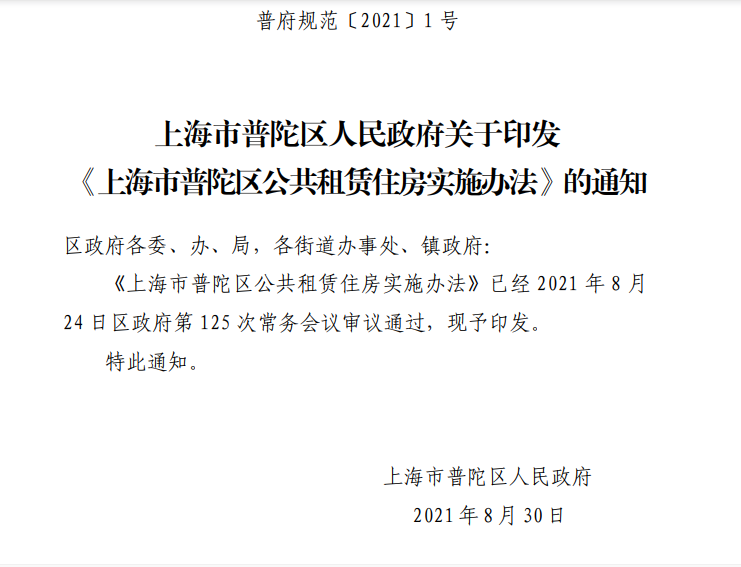 《上海市普陀区公共租赁住房实施办法》已经2021年8月24日区政府第125次常务会议审议通过,现予印发。