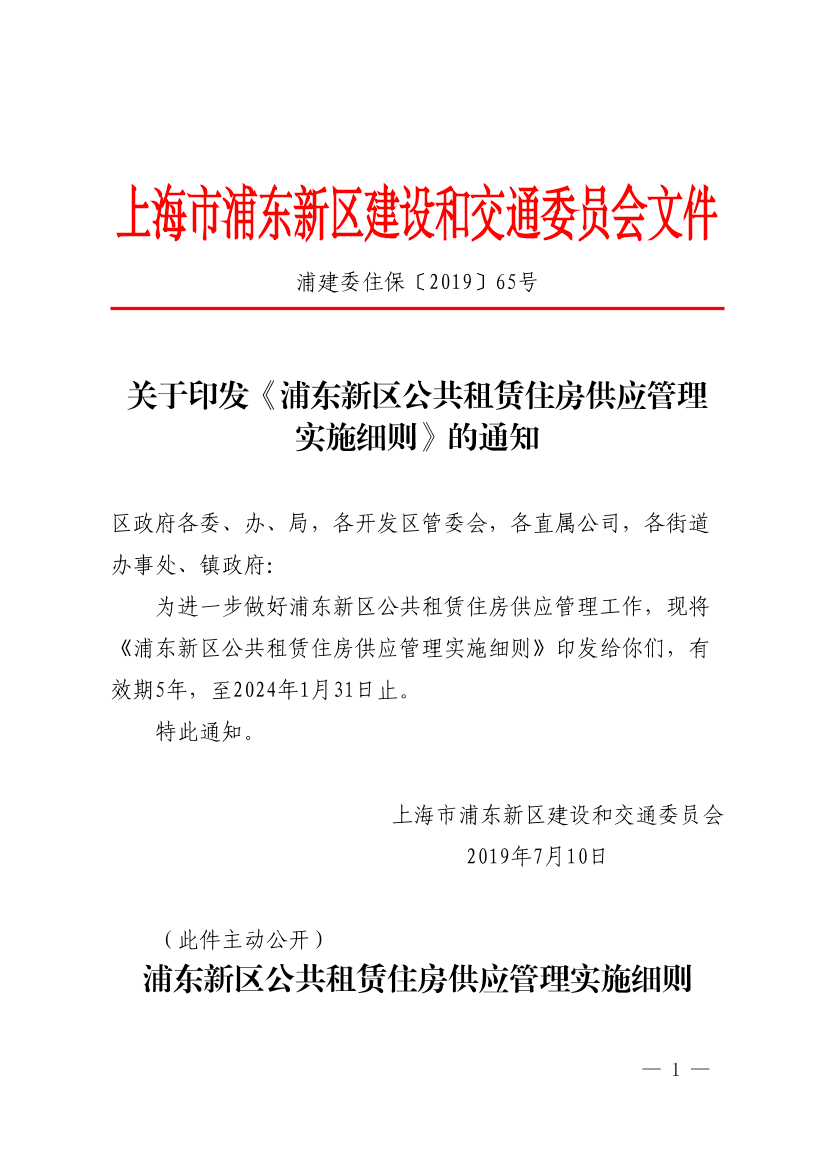 为进一步做好浦东新区公共租赁住房供应管理工作,现将《浦东新区公共租赁住房供应管理实施细则》印发给你们,有效期5年,至2024年1月31日止。