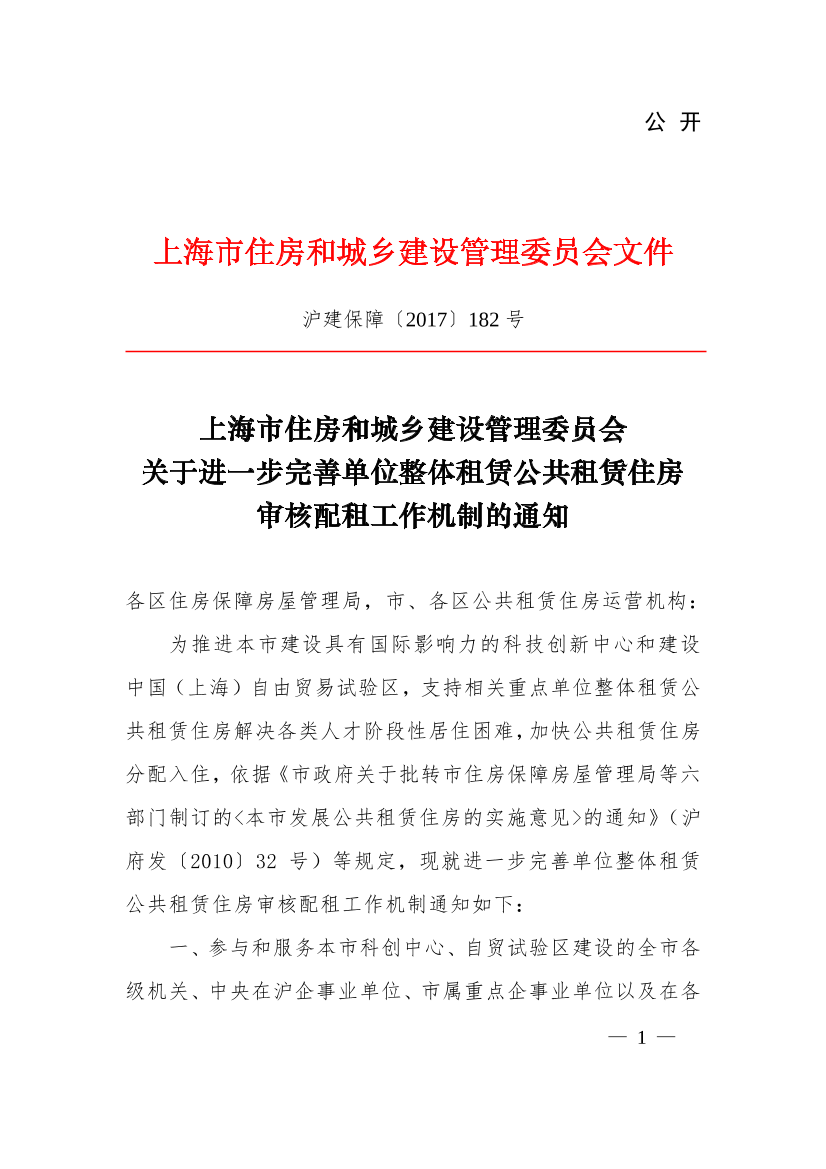 上海市住房和城乡建设管理委员会关于进一步完善单位整体租赁公共租赁住房审核配租工作机制的通知