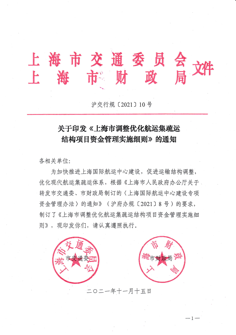 为加快推进上海国际航运中心建设,促进运输结构调整,优化现代航运集疏运体系,根据《上海市人民政府办公厅关于转发市交通委、市财政局制订的〈上海国际航运中心建设专项资金管理办法〉的通知》(沪府办规﹝2021﹞8号)的要求,制订了《上海市调整优化航运集疏运结构项目资金管理实施细则》,现印发你们,请认真遵照执行。