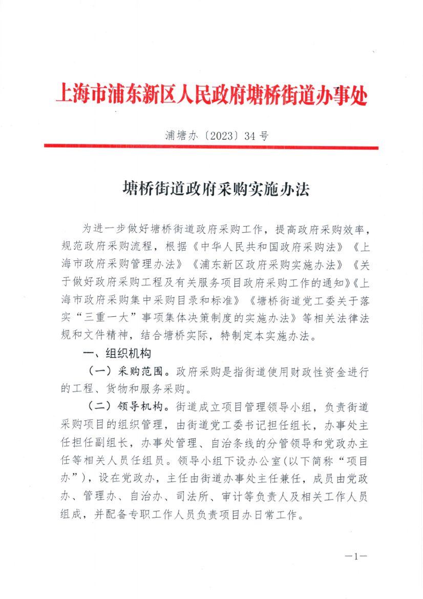 为进一步做好塘桥街道政府采购工作,提高政府采购效率,规范政府采购流程,根据《中华人民共和国政府采购法》《上海市政府采购管理办法》《浦东新区政府采购实施办法》《关于做好政府采购工程及有关服务项目政府采购工作的通知》《上海市政府采购集中采购目录和标准》《塘桥街道党工委关于落实“三重一大”事项集体决策制度的实施办法》等相关法律法规和文件精神,结合塘桥实际,特制定本实施办法。