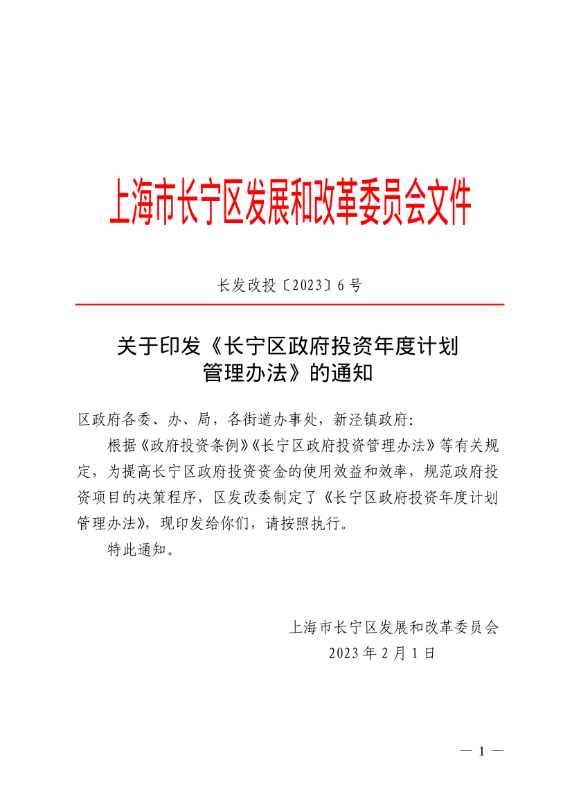 根据《政府投资条例》《长宁区政府投资管理办法》等有关规定,为提高长宁区政府投资资金的使用效益和效率,规范政府投资项目的决策程序,区发改委制定了《长宁区政府投资年度计划管理办法》,现印发给你们,请按照执行。
