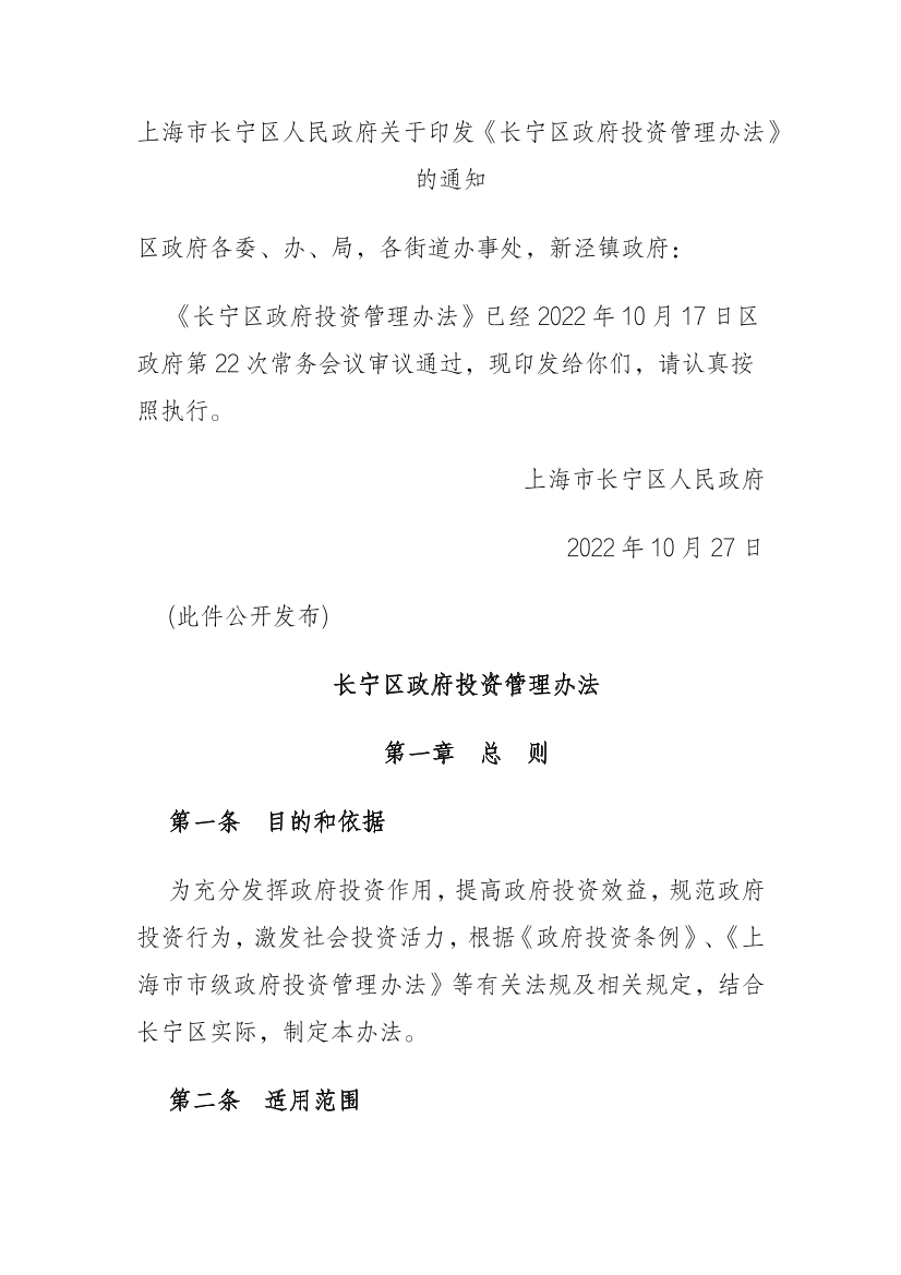 《长宁区政府投资管理办法》已经2022年10月17日区政府第22次常务会议审议通过,现印发给你们,请认真按照执行。