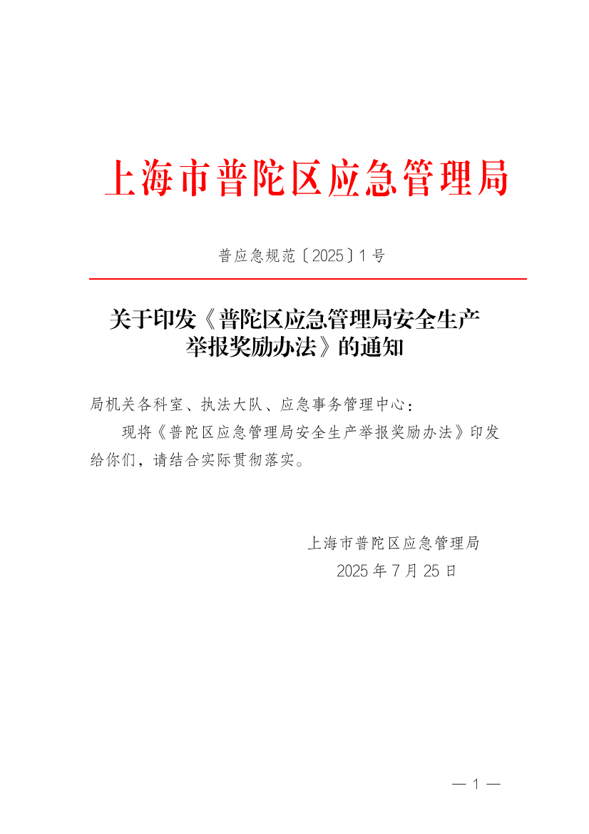 现将《普陀区应急管理局安全生产举报奖励办法》印发给你们,请结合实际贯彻落实。