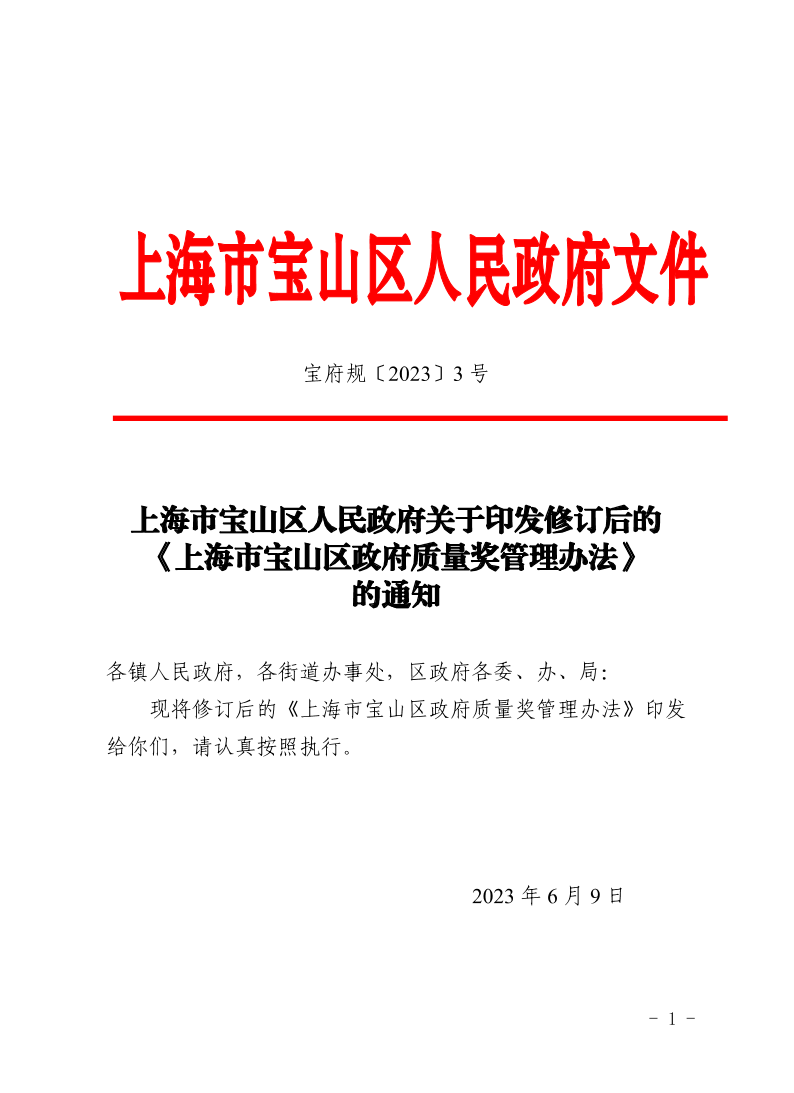 现将修订后的《上海量奖管理办法》印市宝山区政府质发给你们,请认真按照执行。