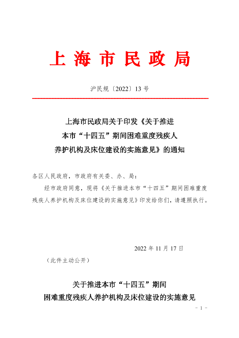 关于印发《关于推进本市“十四五”期间困难重度残疾人养护机构及床位建设的实施意见》的通知