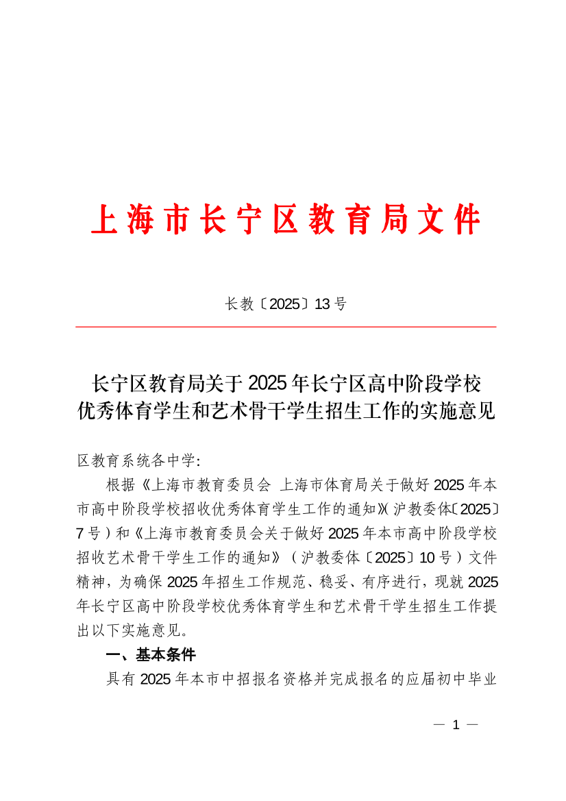 根据《上海市教育委员会 上海市体育局关于做好2025年本市高中阶段学校招收优秀体育学生工作的通知》(沪教委体〔2025〕7号)和《上海市教育委员会关于做好2025年本市高中阶段学校招收艺术骨干学生工作的通知》(沪教委体〔2025〕10号)文件精神,为确保2025年招生工作规范、稳妥、有序进行,现就2025年长宁区高中阶段学校优秀体育学生和艺术骨干学生招生工作提出以下实施意见。