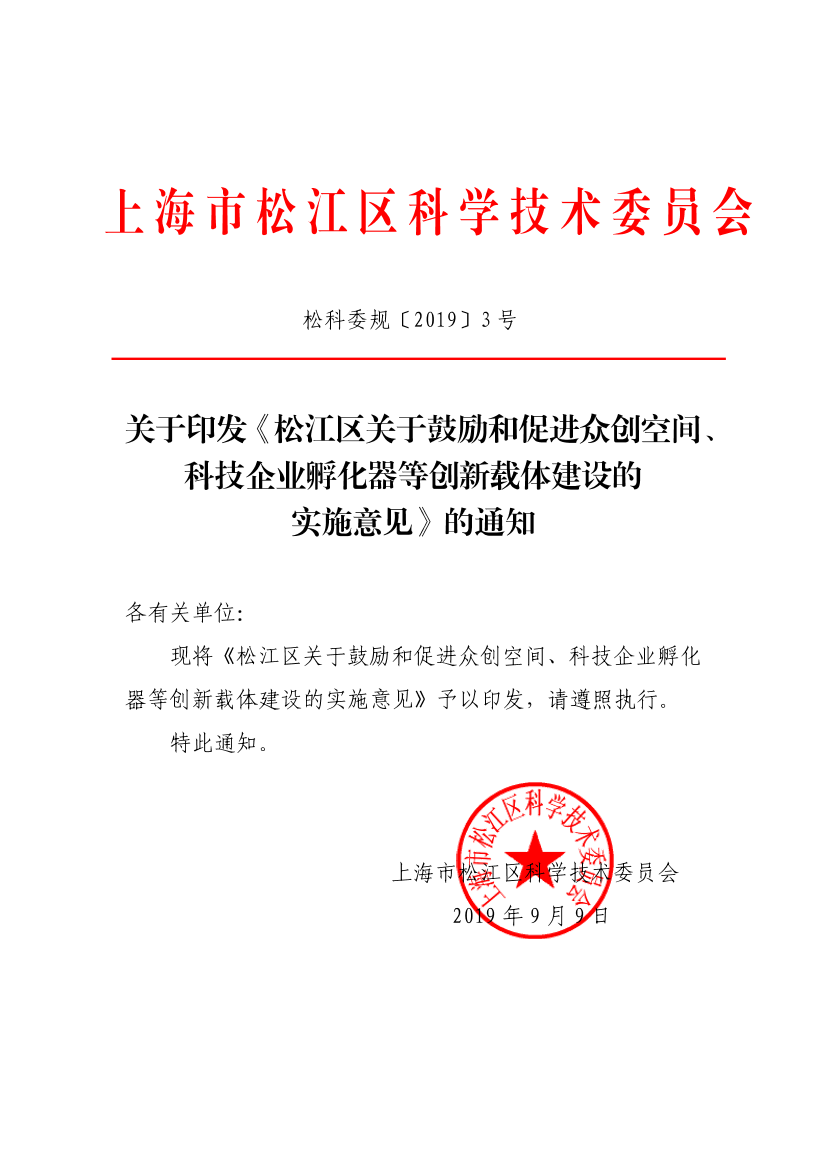 关于印发《松江区关于鼓励和促进众创空间、科技企业孵化器等创新载体建设的实施意见》的通知