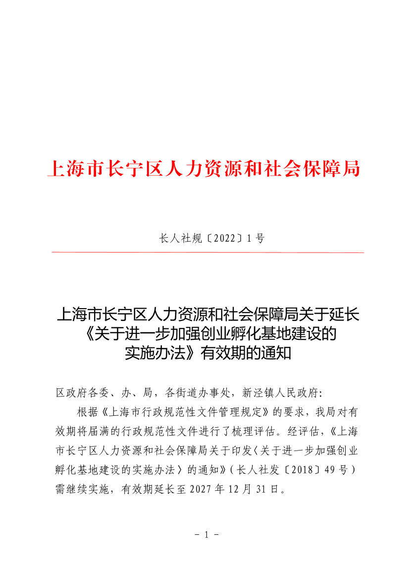 根据《上海市行政规范性文件管理规定》的要求,我局对有效期将届满的行政规范性文件进行了梳理评估。经评估,《上海市长宁区人力资源和社会保障局关于印发〈关于进一步加强创业孵化基地建设的实施办法〉的通知》(长人社发〔2018〕49号)需继续实施,有效期延长至2027年12月31日。