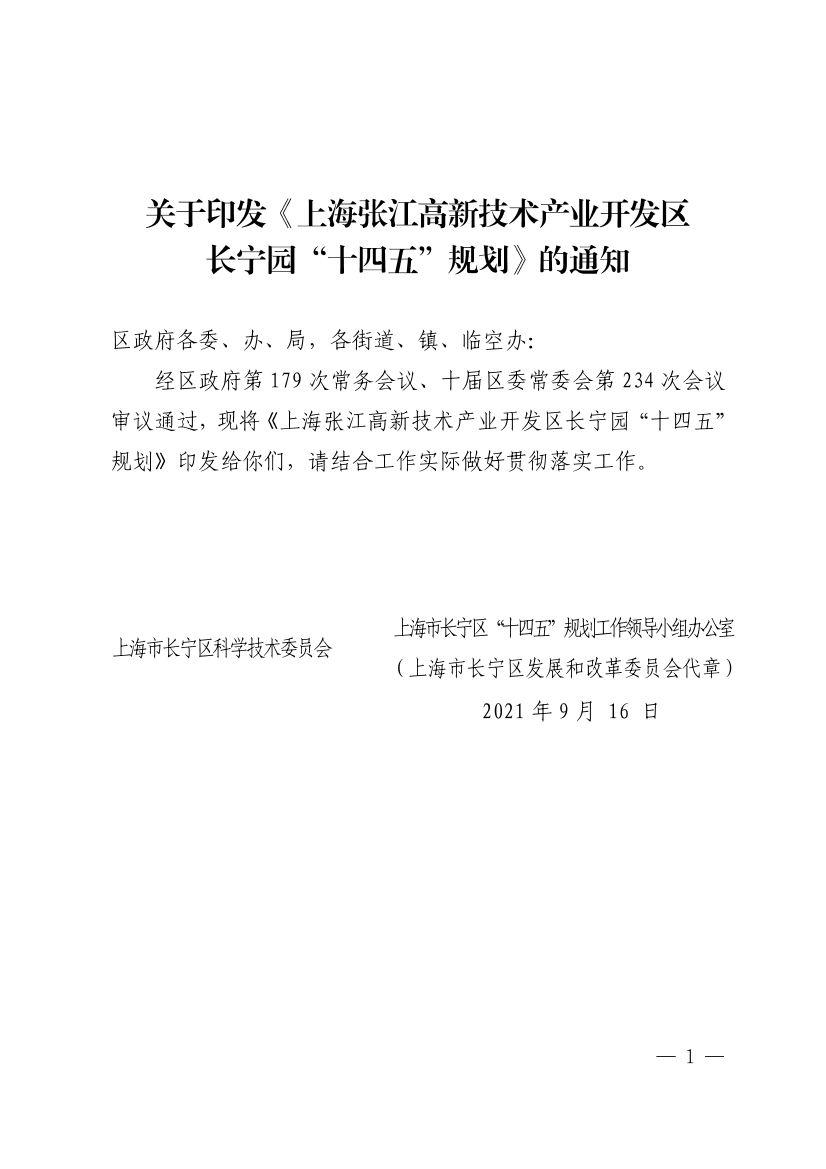 关于印发《上海张江高新技术产业开发区 长宁园“十四五”规划》的通知