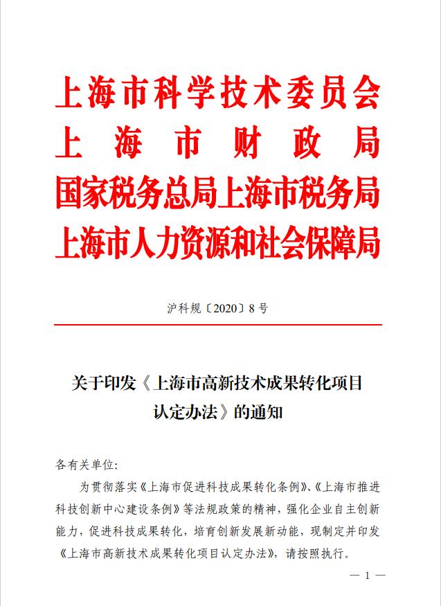 为贯彻落实《上海市促进科技成果转化条例》、《上海市推进科技创新中心建设条例》等法规政策的精神,强化企业自主创新能力,促进科技成果转化,培育创新发展新动能,现制定并印发《上海市高新技术成果转化项目认定办法》,请按照执行。