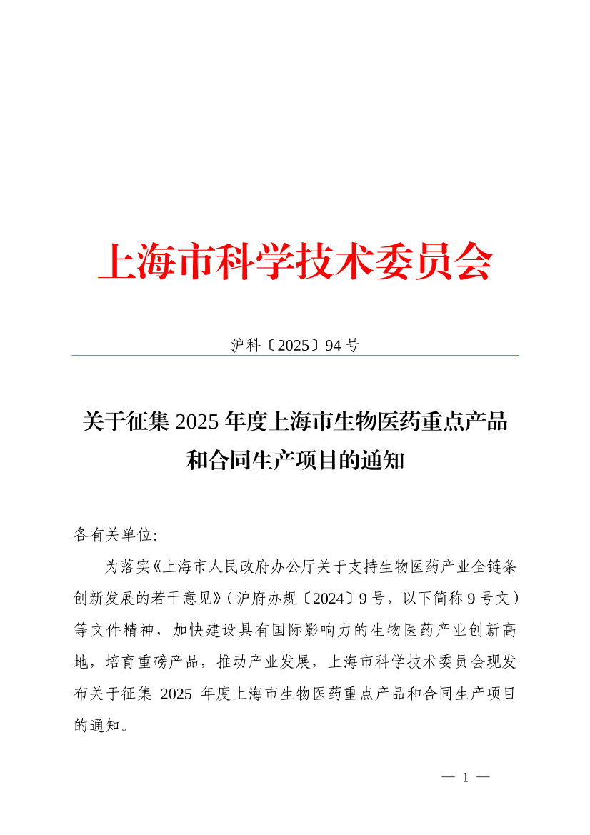 为落实《上海市人民政府办公厅关于支持生物医药产业全链条创新发展的若干意见》(沪府办规〔2024〕9号,以下简称9号文)等文件精神,加快建设具有国际影响力的生物医药产业创新高地,培育重磅产品,推动产业发展,上海市科学技术委员会现发布关于征集2025年度上海市生物医药重点产品和合同生产项目的通知。