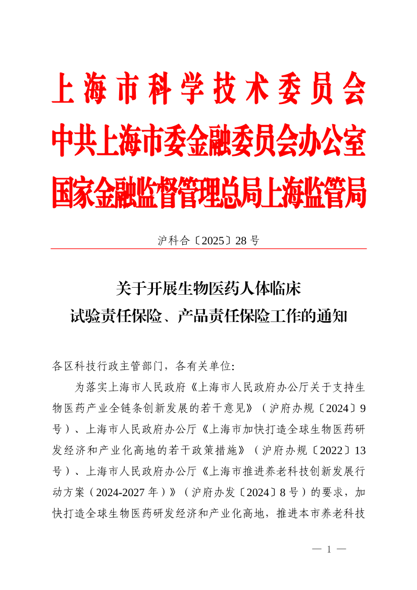 为落实上海市人民政府《上海市人民政府办公厅关于支持生物医药产业全链条创新发展的若干意见》(沪府办规〔2024〕9号)、上海市人民政府办公厅《上海市加快打造全球生物医药研发经济和产业化高地的若干政策措施》(沪府办规〔2022〕13号)、上海市人民政府办公厅《上海市推进养老科技创新发展行动方案(2024-2027年)》(沪府办发〔2024〕8号)的要求,加快打造全球生物医药研发经济和产业化高地,推进本市养老科技创新发展,培育发展新动能,针对生物医药产品、养老科技产品投保人体临床试验责任保险、产品责任保险建立保费补贴机制,现就相关工作通知如下: