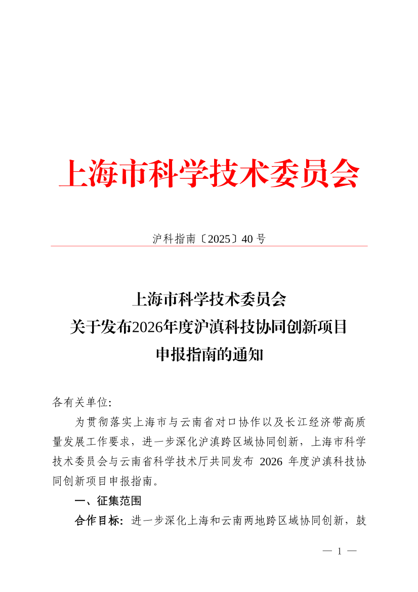 为贯彻落实上海市与云南省对口协作以及长江经济带高质量发展工作要求,进一步深化沪滇跨区域协同创新,上海市科学技术委员会与云南省科学技术厅共同发布2026年度沪滇科技协同创新项目申报指南。