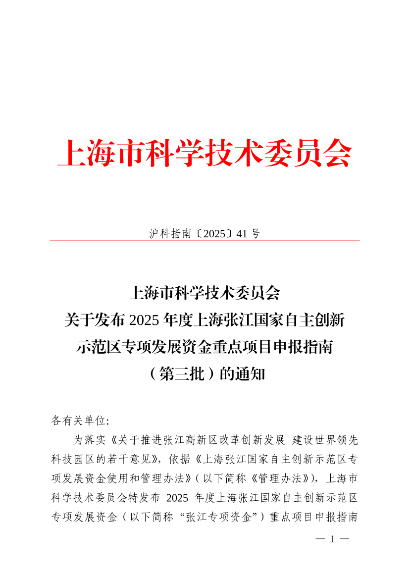上海市科学技术委员会关于发布2025年度上海张江国家自主创新示范区专项发展资金重点项目申报指南(第三批)的通知