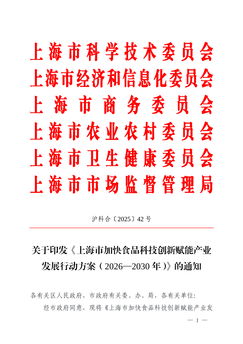 经市政府同意,现将《上海市加快食品科技创新赋能产业发展行动方案(2026—2030年)》印发给你们,请认真推进落实。