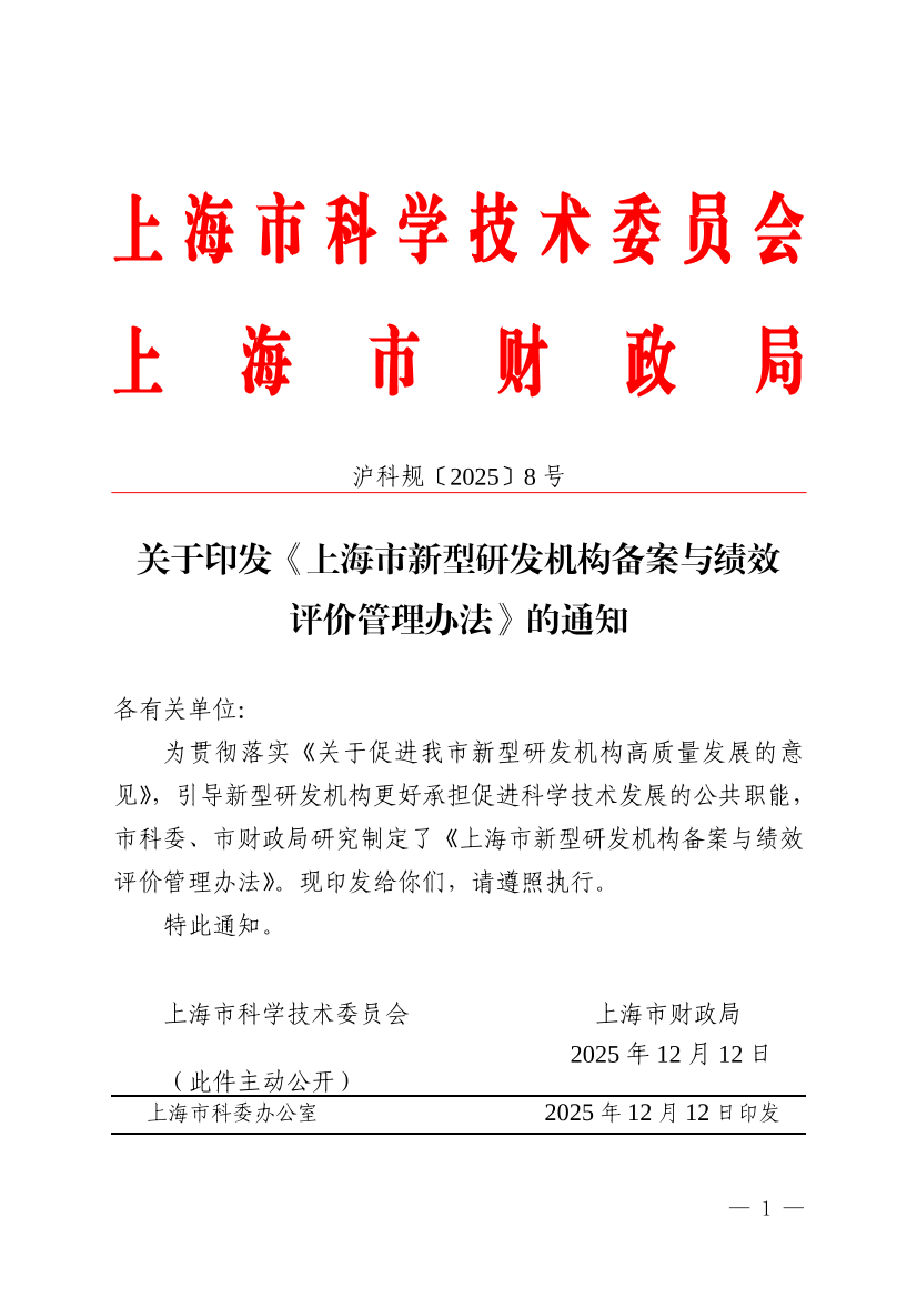 上海市新型研发机构备案与绩效评价管理办法