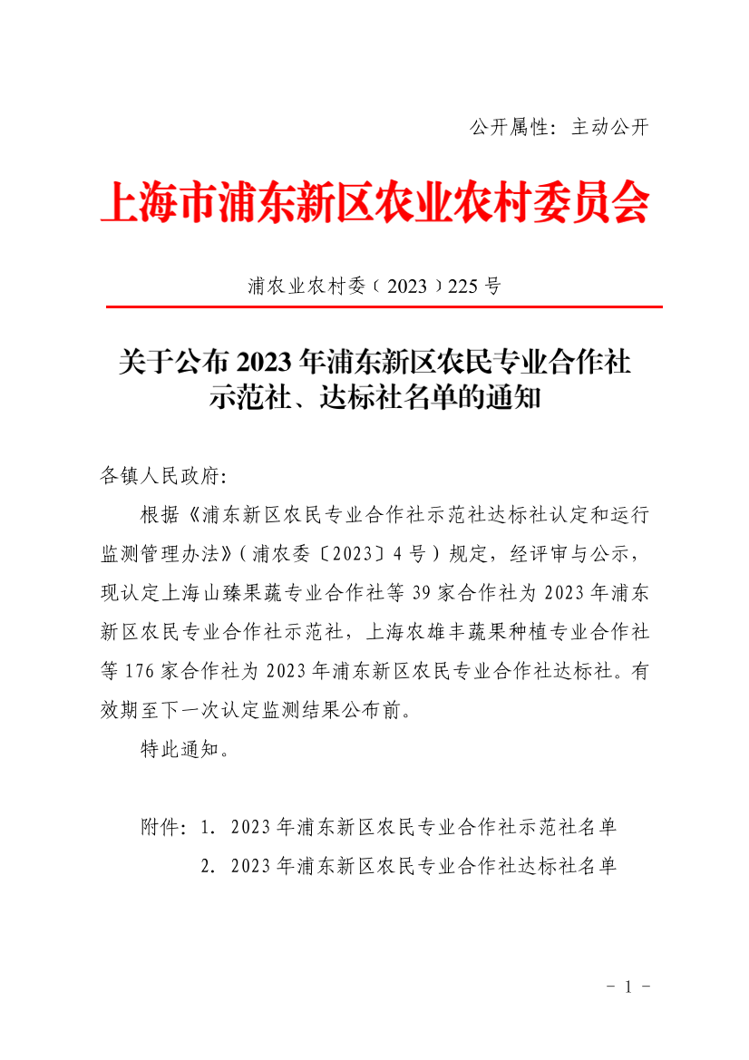 根据《浦东新区农民专业合作社示范社达标社认定和运行监测管理办法》(浦农委〔2023〕4号)规定,经评审与公示,现认定上海山臻果蔬专业合作社等39家合作社为2023年浦东新区农民专业合作社示范社,上海农雄丰蔬果种植专业合作社等176家合作社为2023年浦东新区农民专业合作社达标社。有效期至下一次认定监测结果公布前。