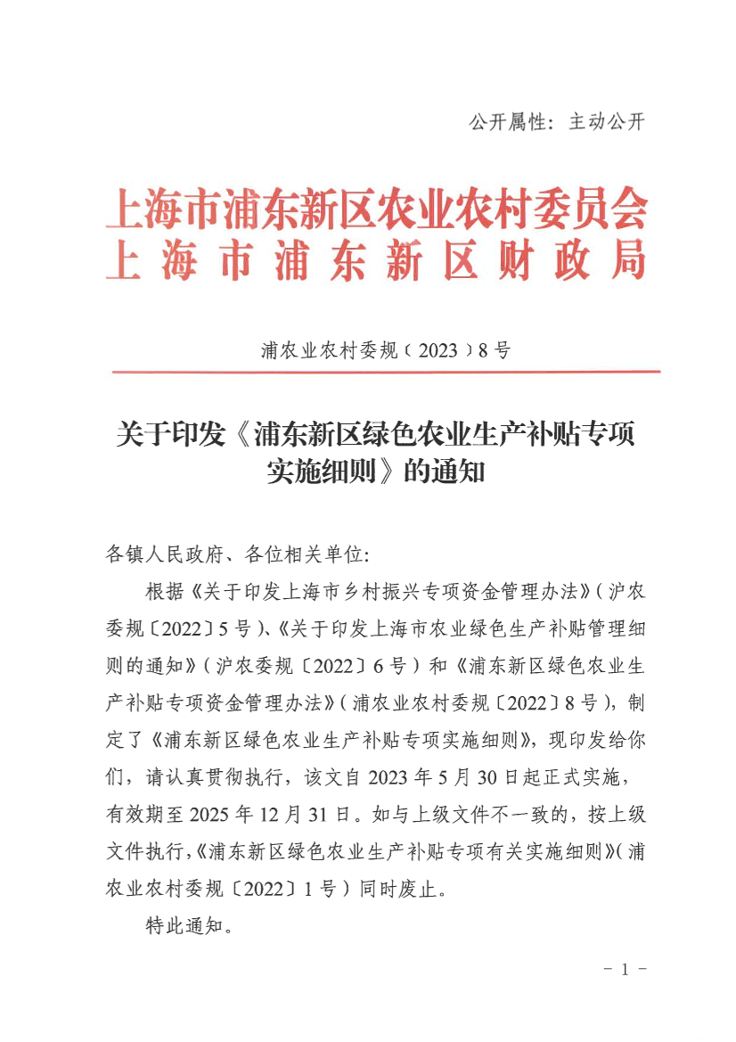 根据《关于印发上海市乡村振兴专项资金管理办法》(沪农委规〔2022〕5号)、《关于印发上海市农业绿色生产补贴管理细则的通知》(沪农委规〔2022〕6号)和《浦东新区绿色农业生产补贴专项资金管理办法》(浦农业农村委规〔2022〕8号),制定了《浦东新区绿色农业生产补贴专项实施细则》,现印发给你们,请认真贯彻执行,该文自2023年5月30日起正式实施,有效期至2025年12月31日。如与上级文件不一致的,按上级文件执行,《浦东新区绿色农业生产补贴专项有关实施细则》(浦农业农村委规〔2022〕1号)同时废止。
