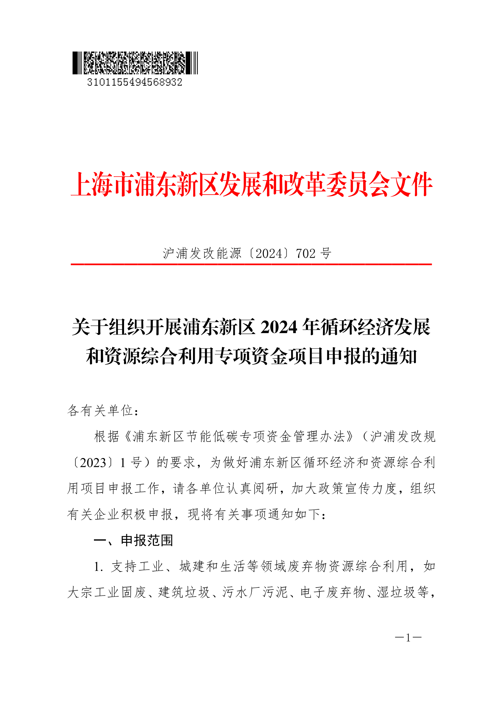 根据《浦东新区节能低碳专项资金管理办法》(沪浦发改规〔2023〕1号)的要求,为做好浦东新区循环经济和资源综合利用项目申报工作,请各单位认真阅研,加大政策宣传力度,组织有关企业积极申报,现将有关事项通知如下: