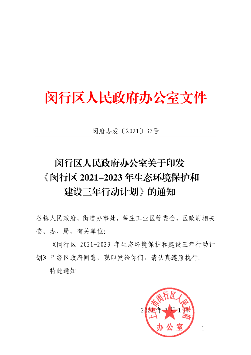 闵行区人民政府办公室关于印发《闵行区2021-2023年生态环境保护和建设三年行动计划》的通知