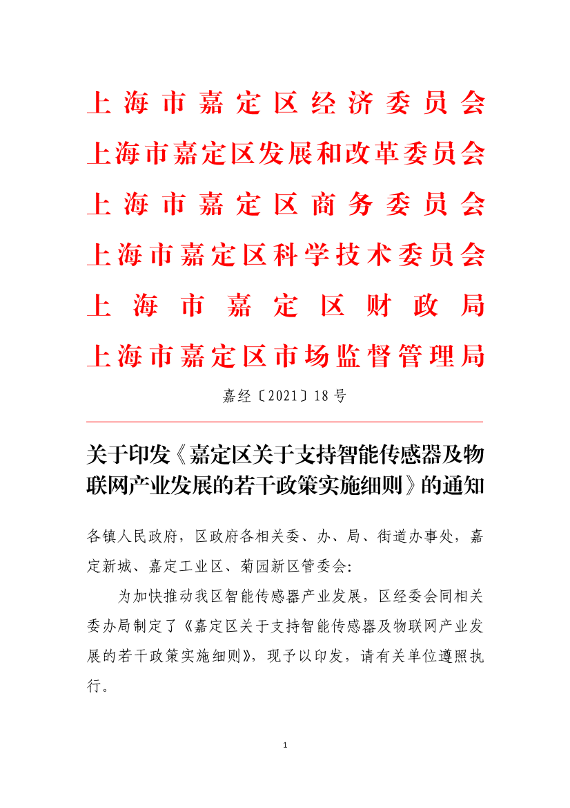 关于印发《嘉定区关于支持智能传感器及物联网产业发展的若干政策实施细则》的通知