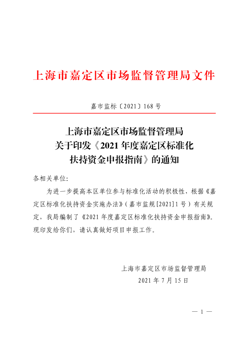 上海市嘉定区市场监督管理局关于印发《2021年度嘉定区标准化扶持资金申报指南》的通知