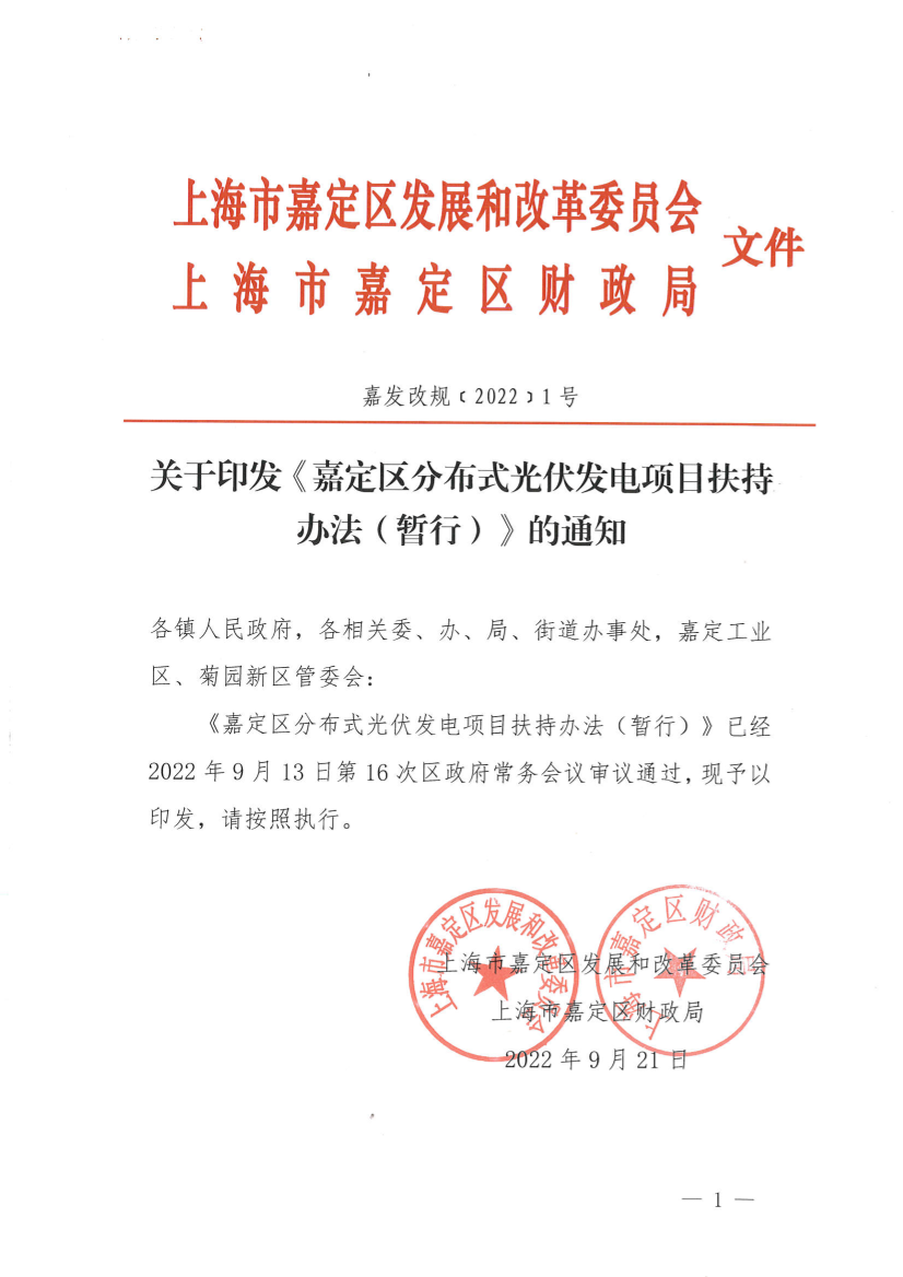 《嘉定区分布式光伏发电项目扶持办法(暂行)》已经2022年9月13日第16次区政府常务会议审议通过,现予以印发,请按照执行。