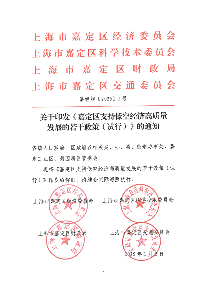 嘉定区支持低空经济高质量发展的若干政策(试行)