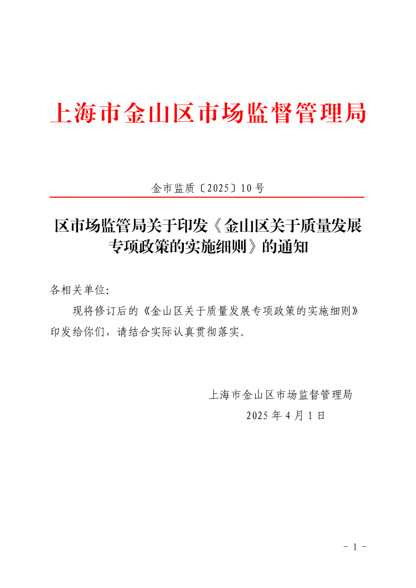 本实施细则自2025年4月1日起实施,有效期至2030年12月31日。金山区市场监督管理局2024年1月12日印发的《金山区关于质量发展专项政策的实施细则》(金市监质〔2024〕4号)自本细则印发之日起废止。