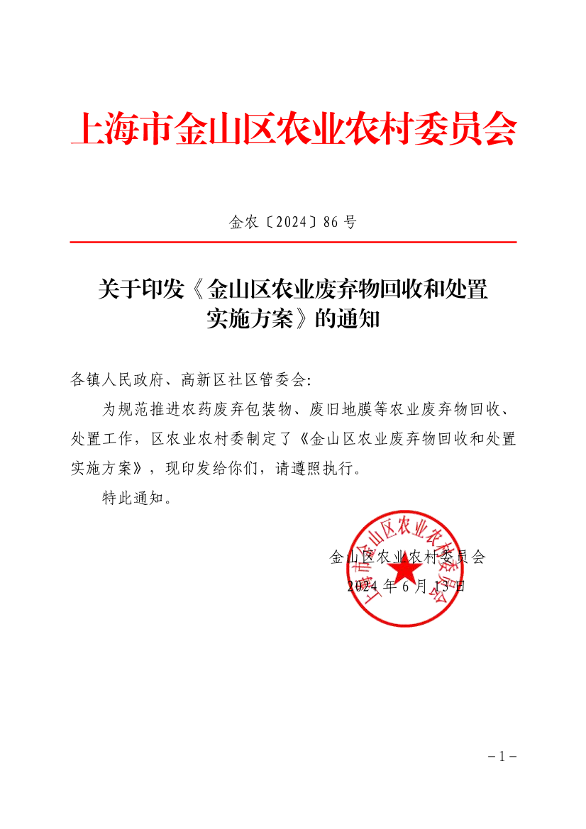 为规范推进农药废弃包装物、废旧地膜等农业废弃物回收、处置工作,区农业农村委制定了《金山区农业废弃物回收和处置实施方案》,现印发给你们,请遵照执行。