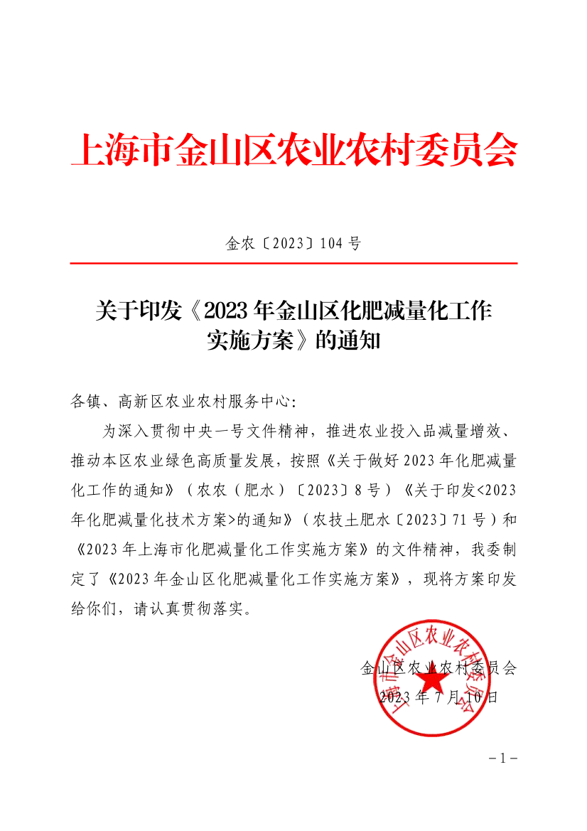 为深入贯彻中央一号文件精神,推进农业投入品减量增效、推动本区农业绿色高质量发展,按照《关于做好2023年化肥减量化工作的通知》(农农(肥水)〔2023〕8号)《关于印发<2023年化肥减量化技术方案>的通知》(农技土肥水〔2023〕71号)和《2023年上海市化肥减量化工作实施方案》的文件精神,我委制定了《2023年金山区化肥减量化工作实施方案》,现将方案印发给你们,请认真贯彻落实。