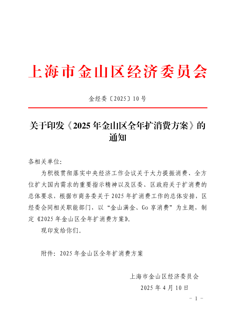 为积极贯彻落实中央经济工作会议关于大力提振消费、全方位扩大国内需求的重要指示精神以及区委、区政府关于扩消费的总体要求,根据市商务委关于2025年扩消费工作的总体安排,区经委会同相关职能部门,以“金山满金、Go享消费”为主题,制定《2025年金山区全年扩消费方案》。