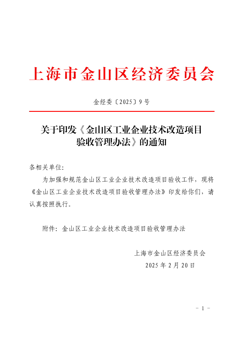 为加强和规范金山区工业企业技术改造项目验收工作,现将《金山区工业企业技术改造项目验收管理办法》印发给你们,请认真按照执行。