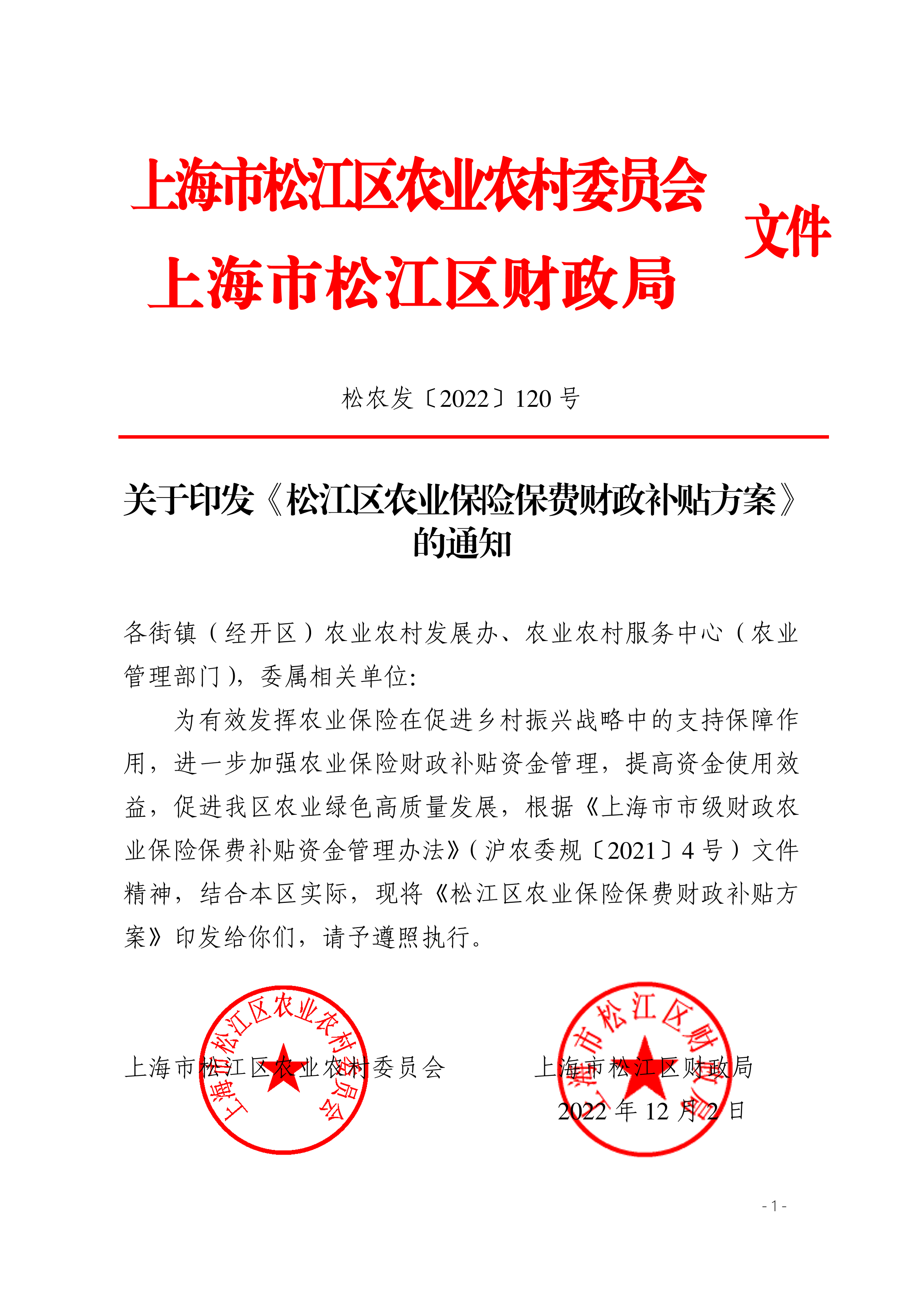 关于印发《松江区农业保险保费财政补贴方案》的通知