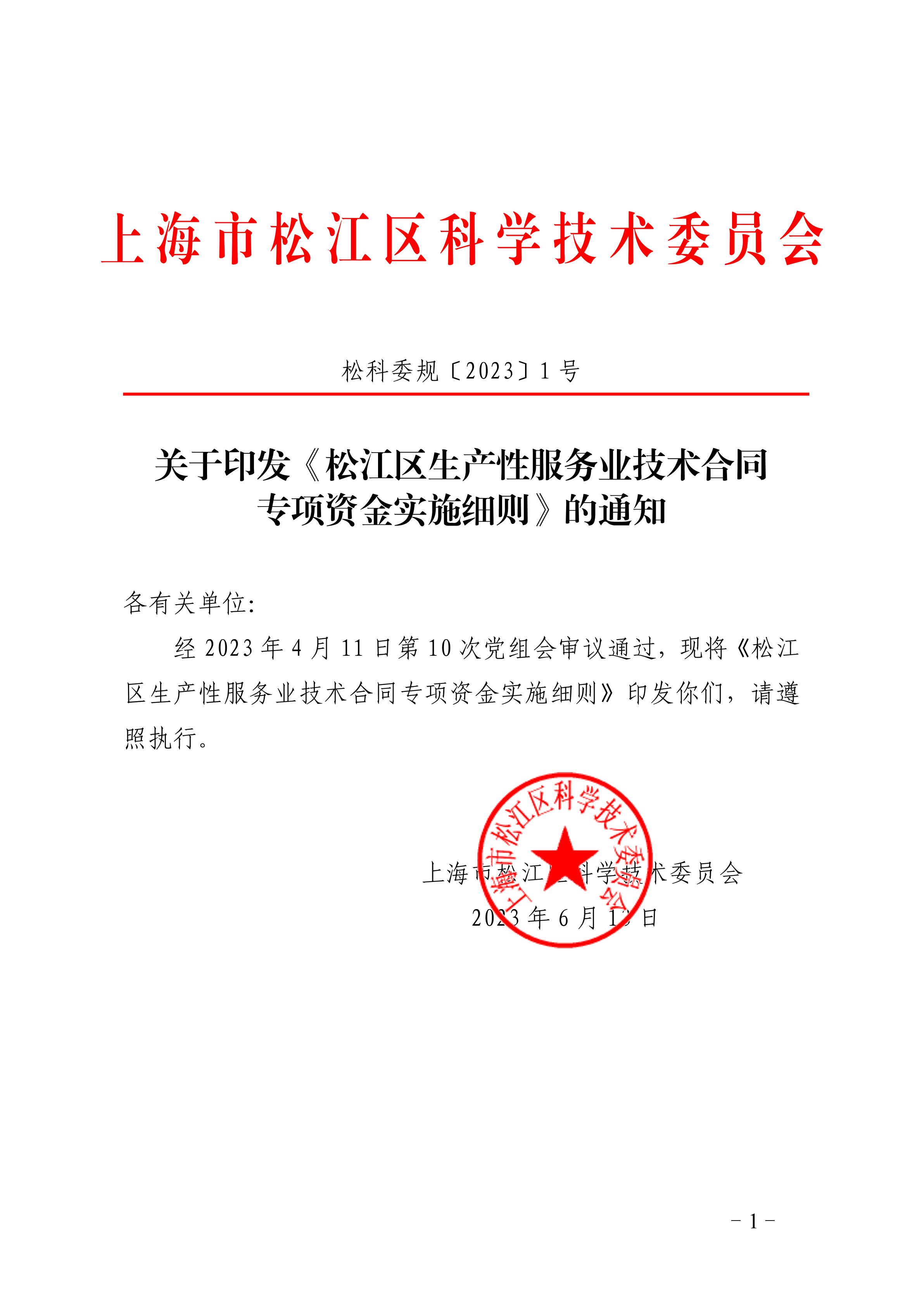 经2023年4月11日第10次党组会审议通过,现将《松江区生产性服务业技术合同专项资金实施细则》印发你们,请遵照执行。