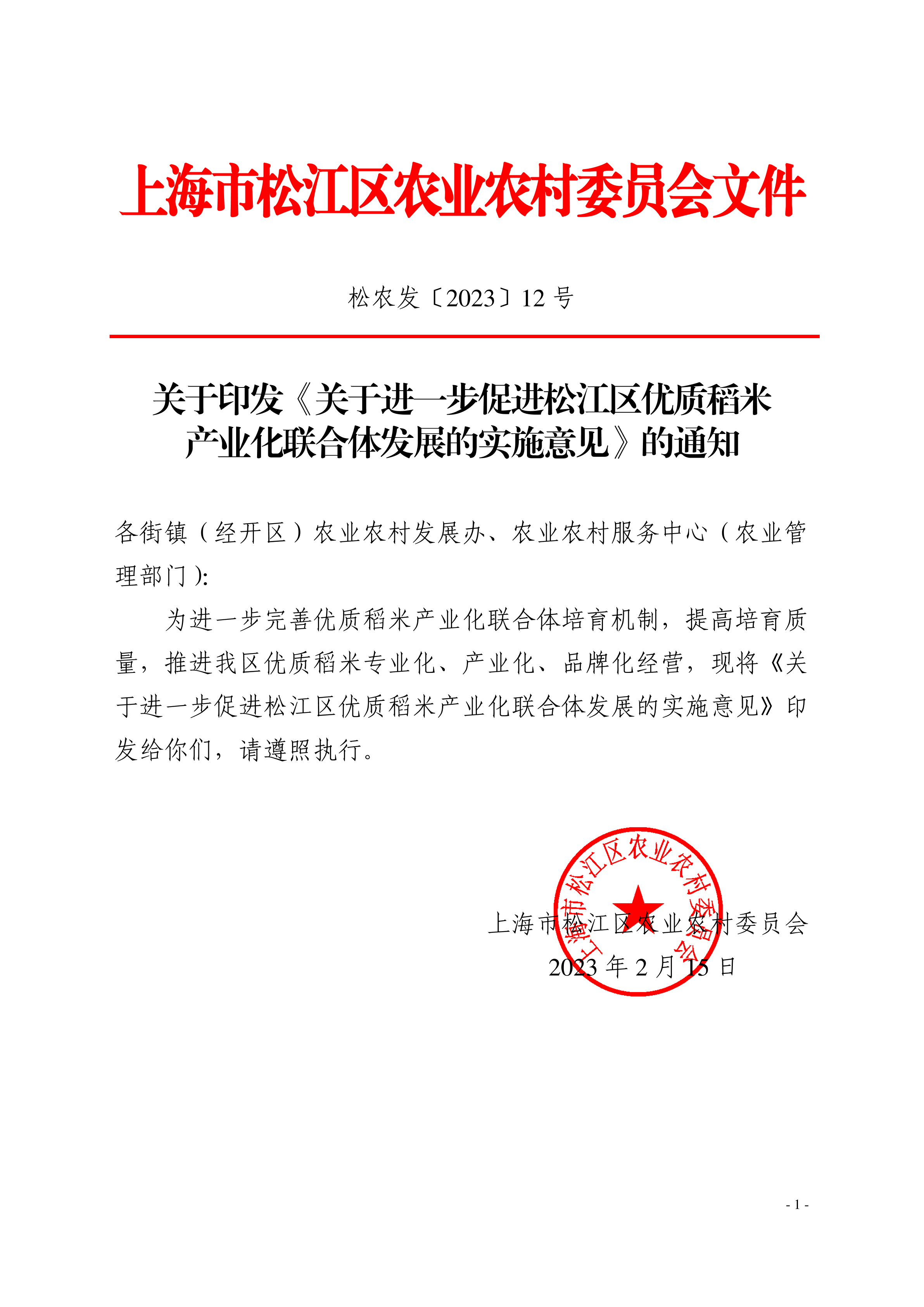 关于印发《关于进一步促进松江区优质稻米产业化联合体发展的实施意见》的通知