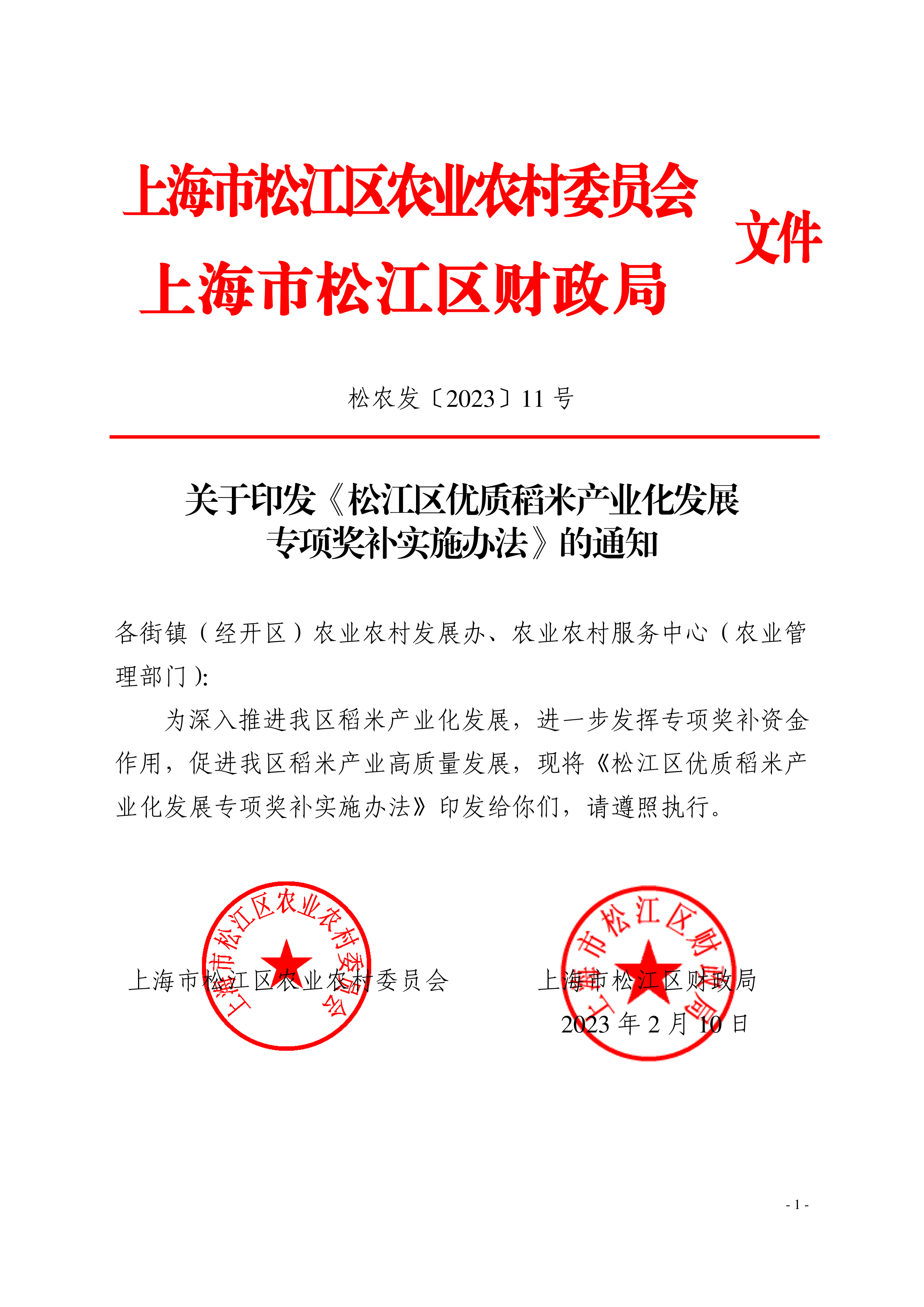 关于印发《松江区优质稻米产业化发展专项奖补实施办法》的通知