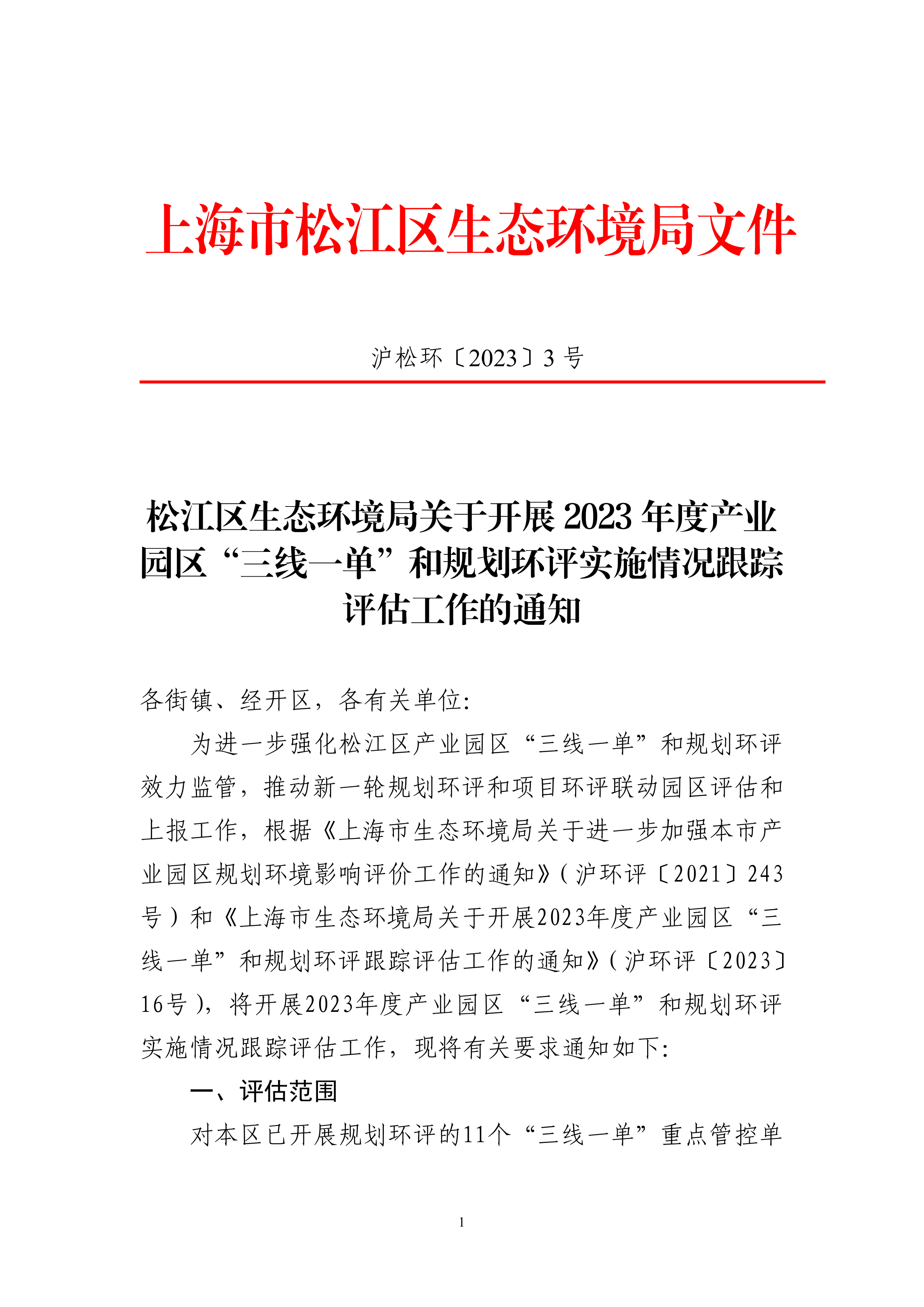 为进一步强化松江区产业园区“三线一单”和规划环评效力监管,推动新一轮规划环评和项目环评联动园区评估和上报工作,根据《上海市生态环境局关于进一步加强本市产业园区规划环境影响评价工作的通知》(沪环评〔2021〕243号)和《上海市生态环境局关于开展2023年度产业园区“三线一单”和规划环评跟踪评估工作的通知》(沪环评〔2023〕16号),将开展2023年度产业园区“三线一单”和规划环评实施情况跟踪评估工作,现将有关要求通知如下: