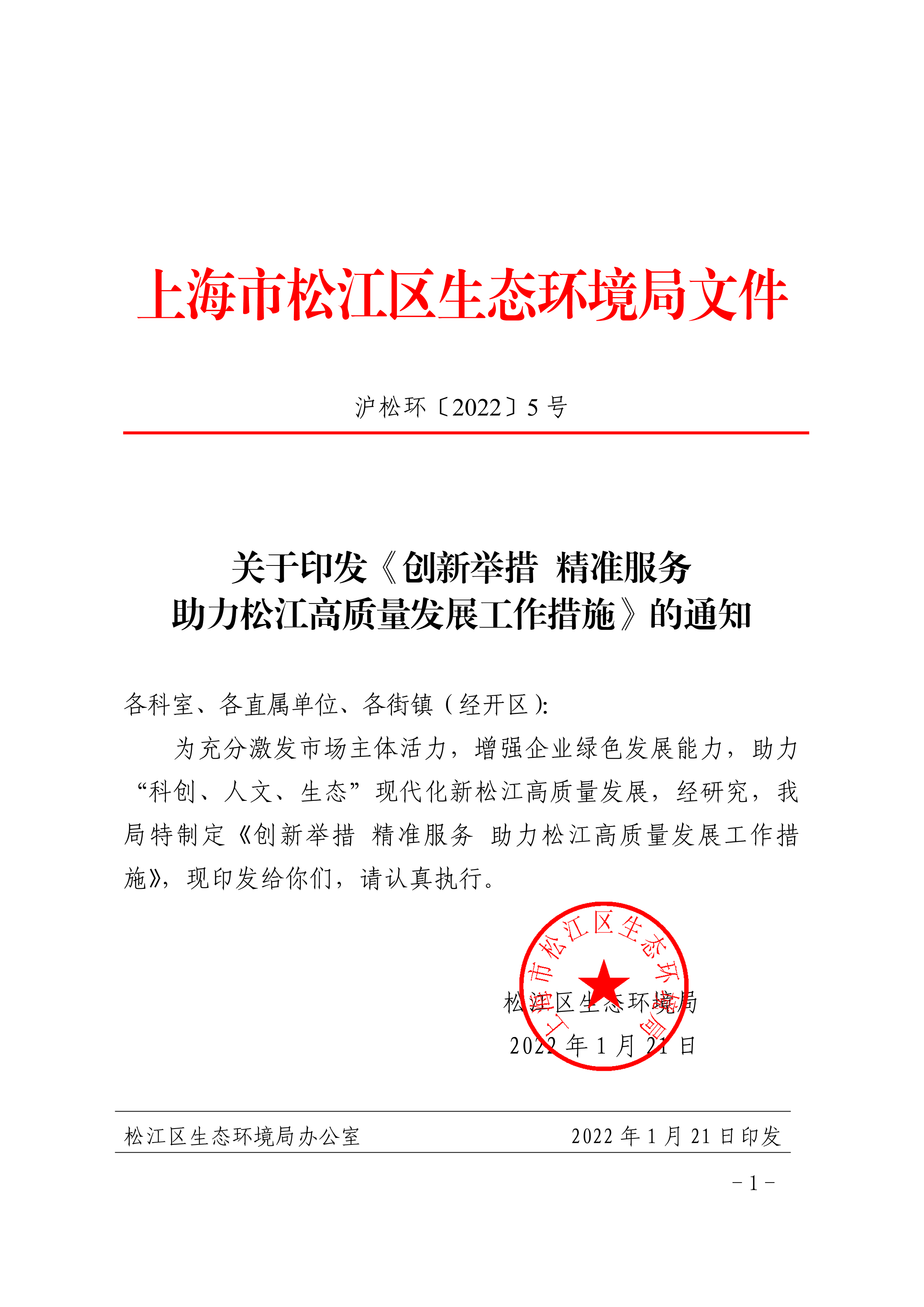 为充分激发市场主体活力,增强企业绿色发展能力,助力“科创、人文、生态”现代化新松江高质量发展,经研究,我局特制定《创新举措 精准服务 助力松江高质量发展工作措施》,现印发给你们,请认真执行。